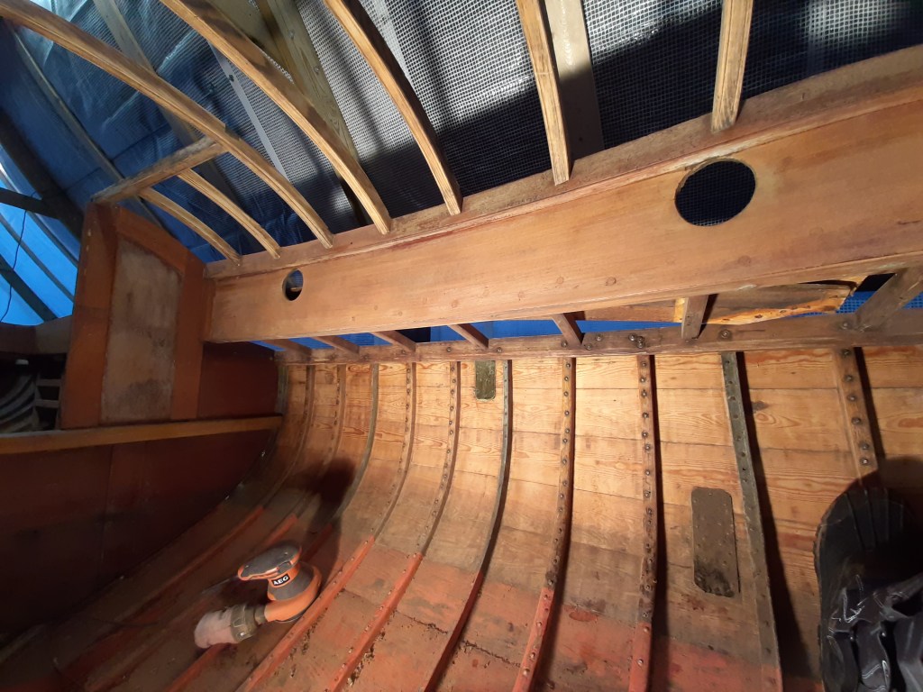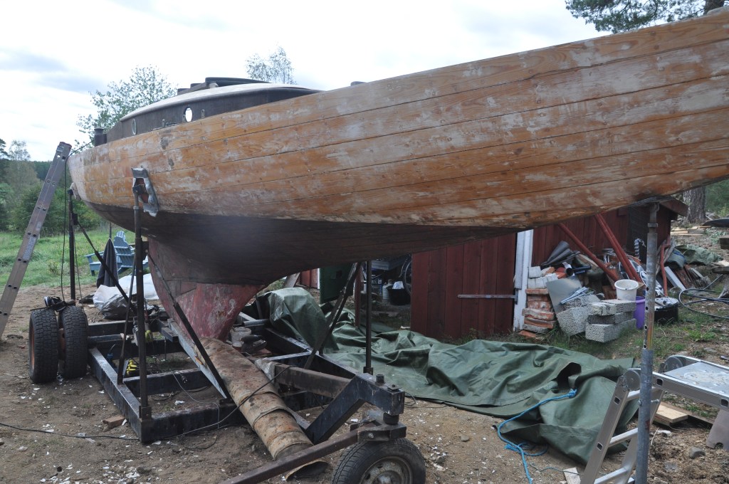 Vid det tillfälle 2018, då jag först såg båten hos Ola Häggstöm, såg jag potentialen i båten. Inga reparationer, alla spant sitter tätt intill bordläggningen, inga spant brutna på känsliga ställen och inget som skvallrar om ruttet trä någonstans. Även Olas positiva bedömning av båten gjorde sitt till att jag köpte båten för 5000 kr. Senare har det visat sig att denna bedömning var korrekt. Jag har hittat tre brutna spant en dm från deras undre avslut. De har fått vara utan åtgärd hittills. Resningsbultar och järnspant saknar nästan helt rost, kölbultar har kvar sin ursprungliga tjocklek och muttrarna till desamma är så opåverkade att jag skulle kunna få en hylsa att greppa. Hon har kanske mest seglats i sötvatten? Det enda som var ruttet var ekbalken som stabiliserar skottet till ruffen. Dessutom var hjärtstocken hårt angripen av rost, antagligen beroende på att den galvade hjärtstocken stod i kontakt med rostfritt järn. MEN de generösa gliporna mellan borden oroar. Som mest har jag mätt upp dryga 4 mm mellan borden. Hur ska det gå?