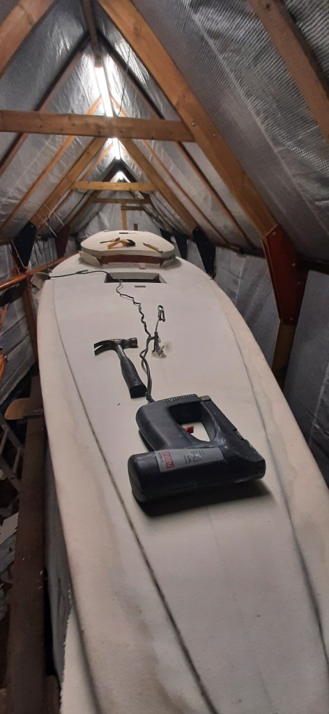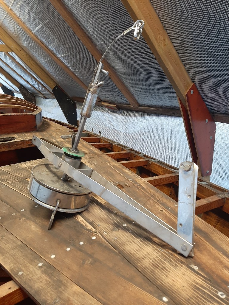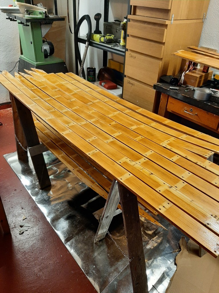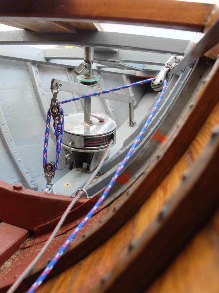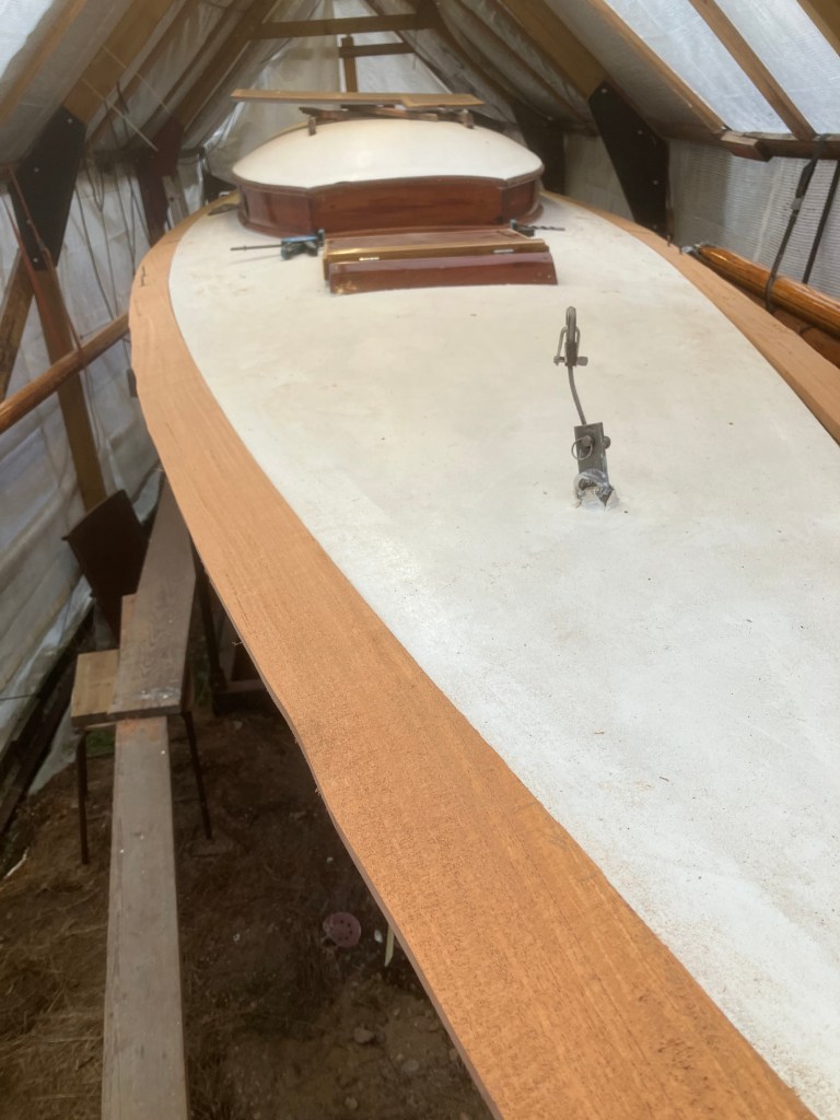 De flesta däcksribbor och samtliga rufftaksribbor monterade jag bort. Imponerad av båtbyggaren Nyberg, som på ett så fantastiskt sätt hyvlat till ribborna på överbyggnaden. De är ju både koniska och avsmalnande, och det fanns inte den minsta lilla glipa mellan ribborna. Skrapar, slipar och lackar undersidan av ribborna i källaren till huset. Nu är det dags att montera rullfocksmekanismen i fören. I princip en lätt åtgärd, men lite tankar om hur vinkeln till masten skulle bli rätt. Vi får se hur det gick. Hur man monterar den utan att ha däcket borta förstår jag inte.