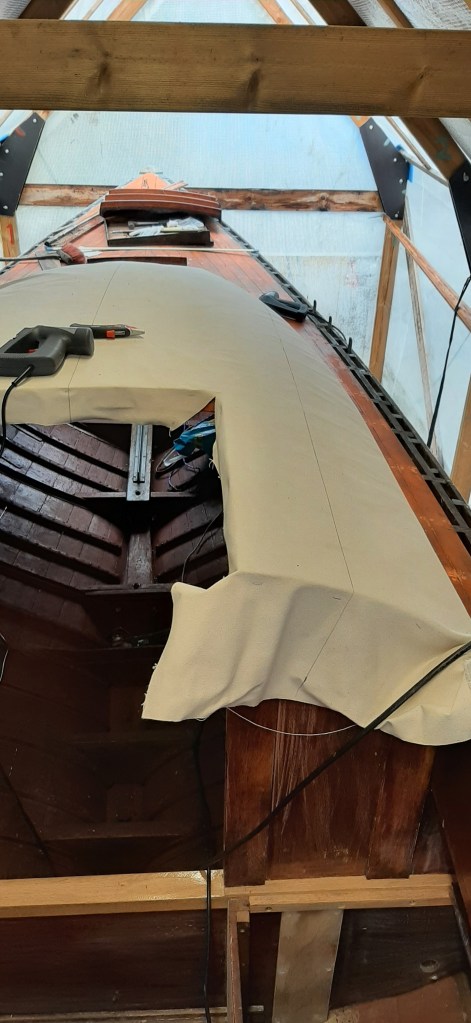 Återmonterar alla ribbor och behandlar dem på ovansidan med blymönja. Nu är det dags att montera däcksduken. Handlar in detta på Råseglarhuset, en lite tunnare för överbyggnad och en kraftig för däcket. Följer anvisningarna, sträck duken ordentlig, sätt fast med rostfri klammer och kopparnubb, dränk in duken med kokt linolja med zinkvitt. Blir tvungen att skarva däcksduken akter om sittbrunn. Den konvexa ytan på överbyggnaden blev däremot perfekt. Gittan var en utmärkt hjälp med dessa tyger. Det är nåt hon kan.