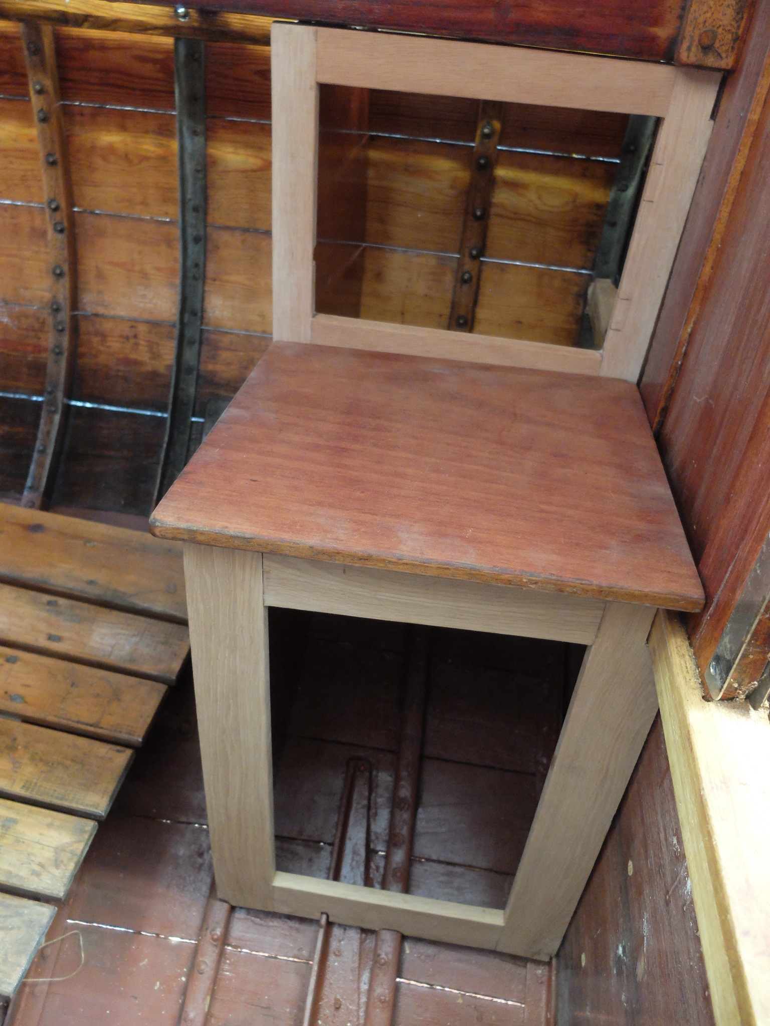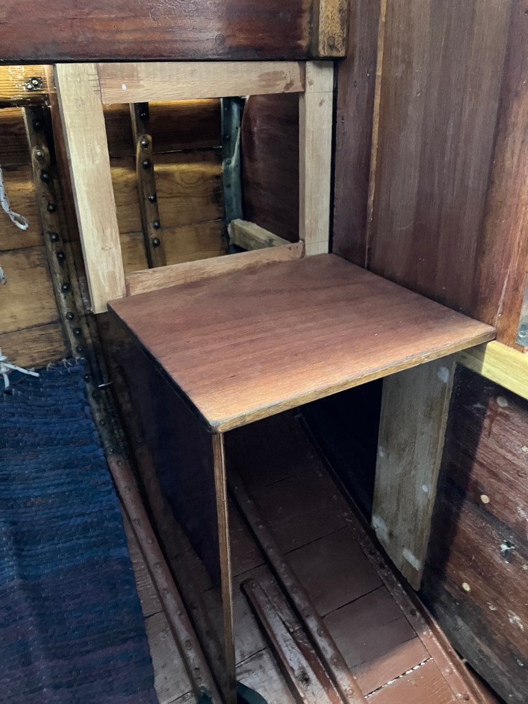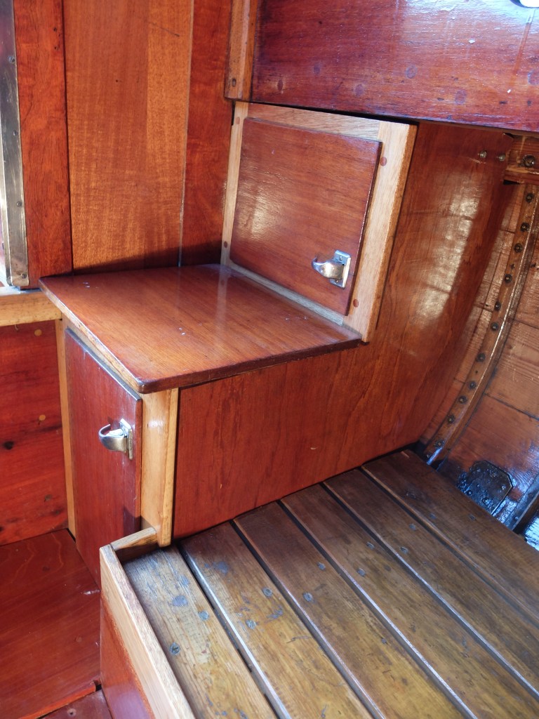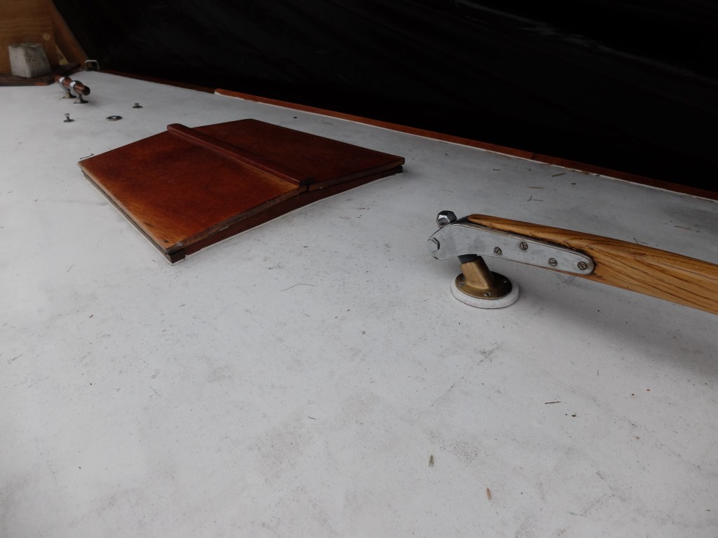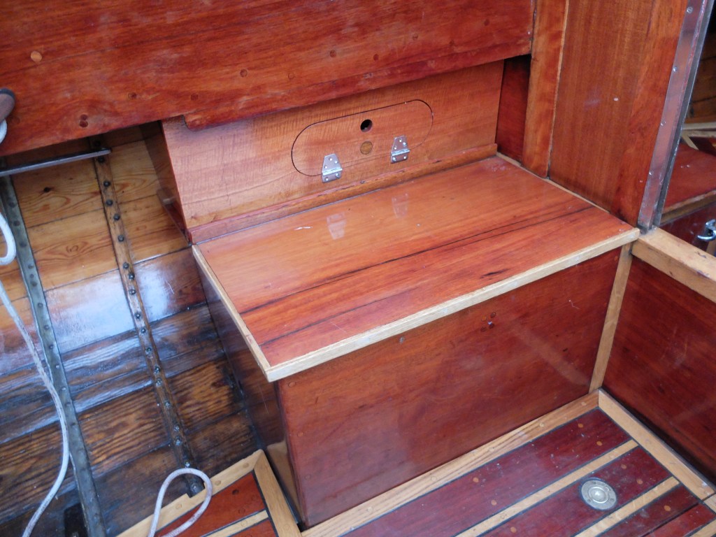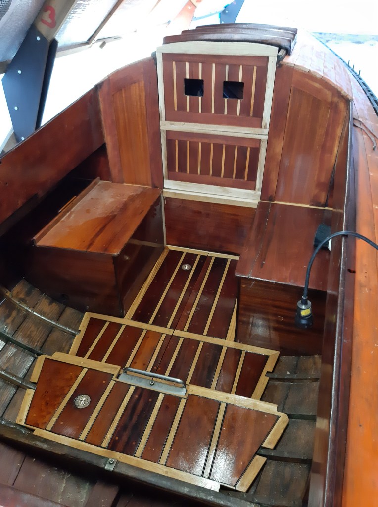 Förluckan tillverkar jag av mahognyplywood men använder en del gamla delar. Monterar en fotlist i tre delar. Monterar två lådor under akterdäck som jag tagit från den gamla M22an.