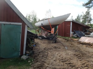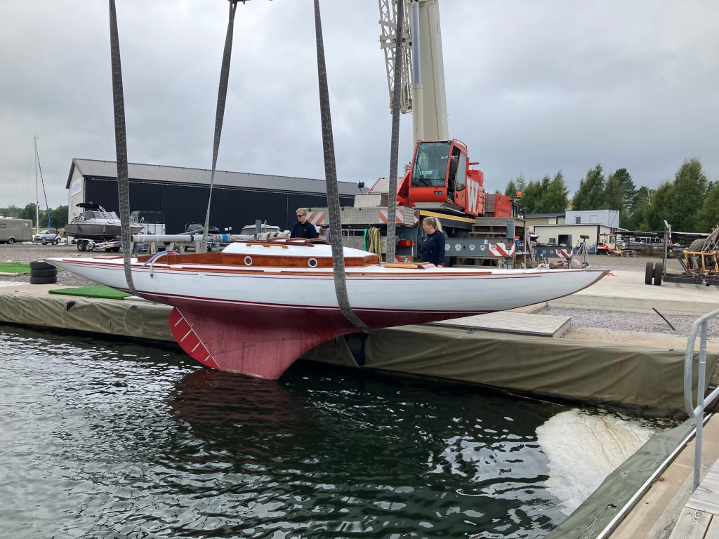 Så var det då dags för henne att komma i sjön efter typ 20 år. En traktor bogserar ner TUR som hon nu heter till Loftahammars Varv och Marina. Kranen de har är lite upptagen med andra lyft, så hon får stå på land ett dygn och så i igen. Hon får hänga i banden så att lite av friborden också är under vattenytan. Jag har plockat bort allt löst inifrån båten. Ett tips är att använda en länspump där du kan bestämma hur mycket den ska pumpa ur. JULA har en sån pump där man kan ställa in så att endast en liten mängd vatten pumpas ut vid varje tillfälle. Vitsen är att banden då inte behöver ta hela tyngden utan blir mer som en säkerhet. Jag upplevde att tyngden under flera dygn kan påverka skrovet. Och med vågor utan länspump ska båten inte hänga i band.