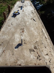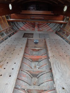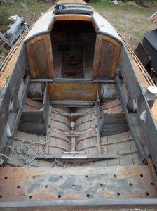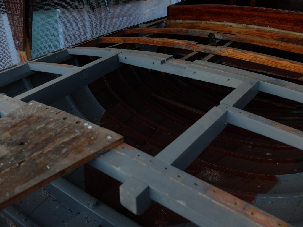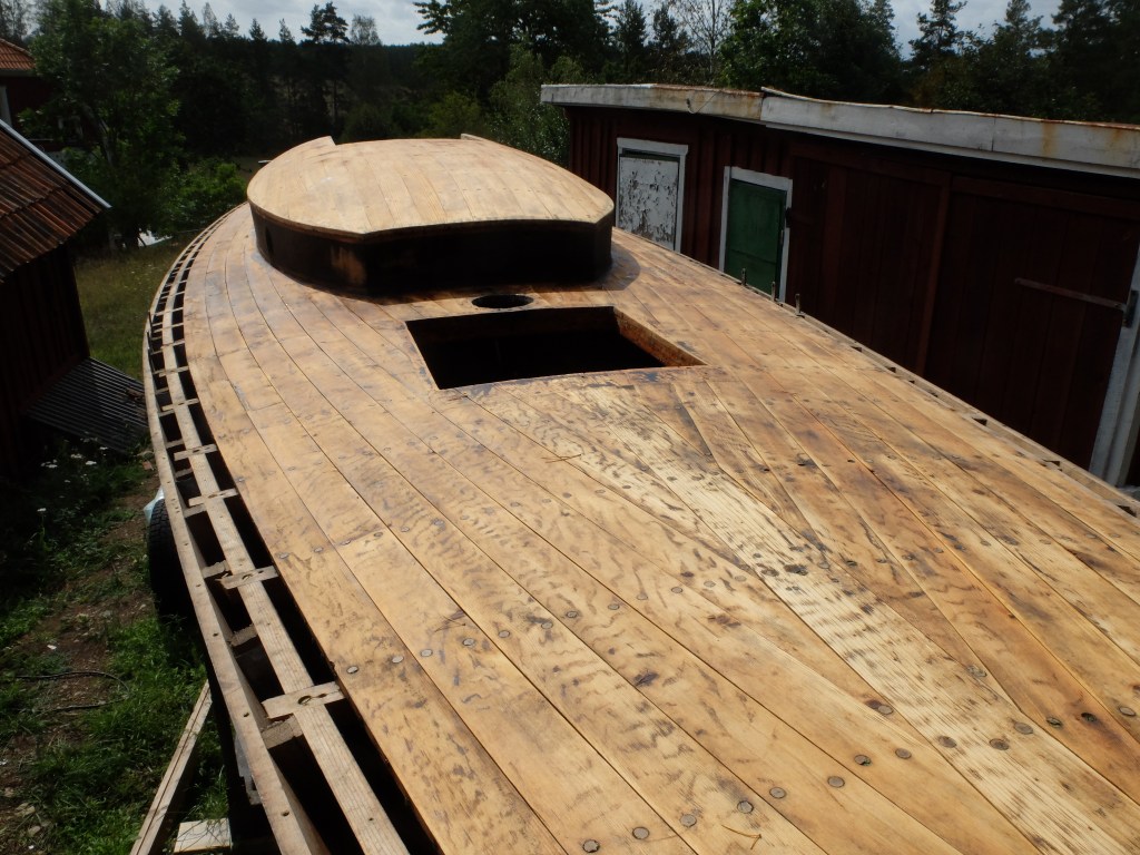 För att lättare komma åt insidan av skrovet demonterade jag först de flesta av de väl bevarade däcksribborna. Det tog många timmar att skruva ur de gamla spårskruvarna med torkat spackel i spåren. Men jag tjänade mycket tid på det i slutänden.