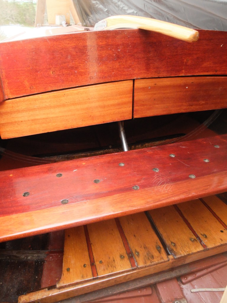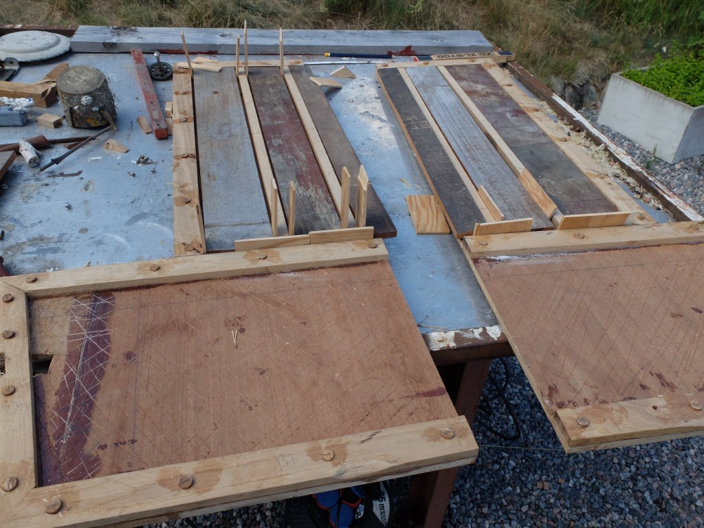 Durkarna tillverkar jag av mahogny från de gamla tofterna. Korta bitar som jag kombinerar med ek, vilket jag har tillgång till, som jag limmar/skruvar på plywood. Detta var innan jag köpt mahognyn. Nu blev det så att mahogny och ek fick bygga upp durkarna och ruffluckorna. Och så har jag fortsatt, att kombinera ek med mahogny. Tofterna invid sittbrunn har jag helt tagit från den gamla M22an, med anpassningar för skrovformen. Luckorna till ruffem från den gamla M22an får jag anpassa genom att lägga till ek för att passa.