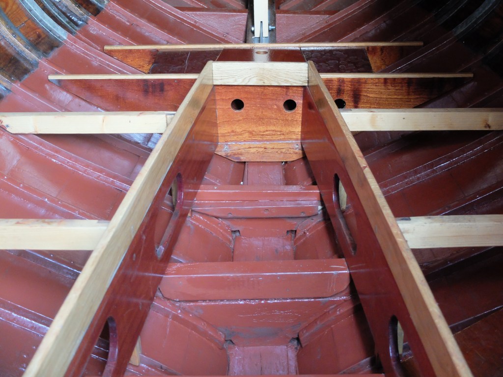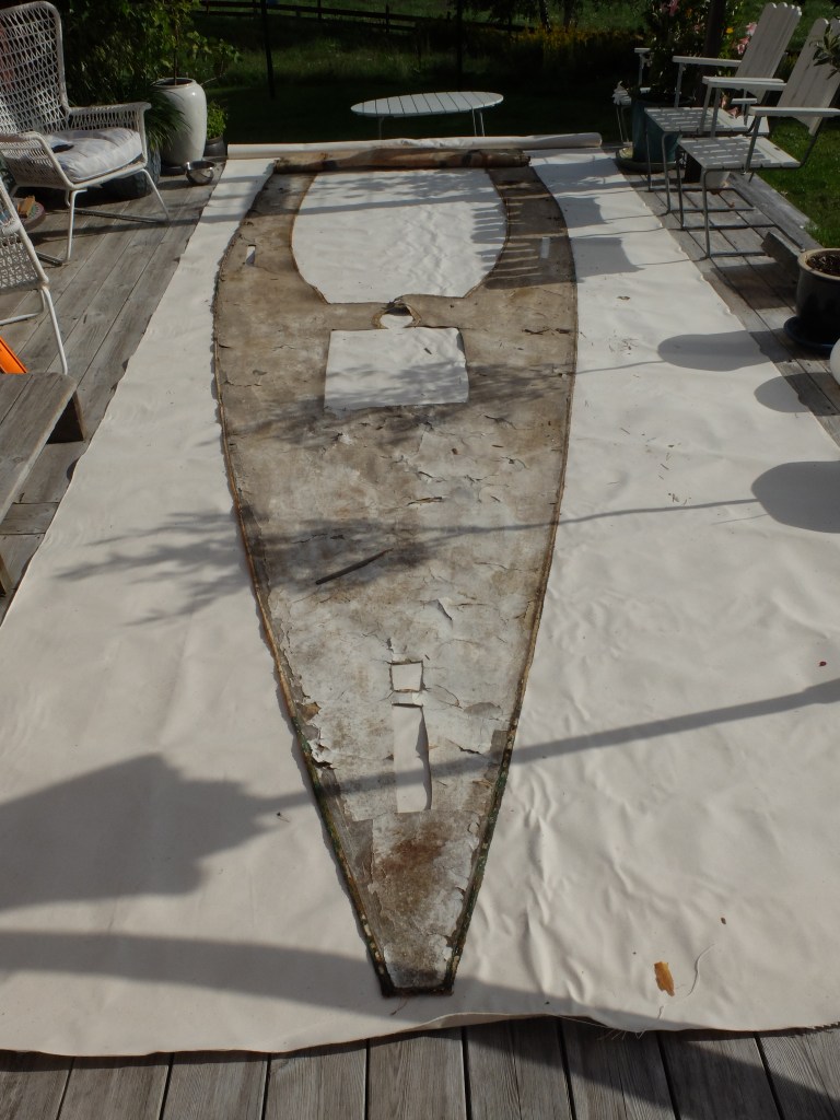 Skrapade rent in och utsida av skrovet och behandlade med rå linolja/terpentin. Femton liter fick jag nog in i borden. Jag har sedan behandlat insidan med fernissa och järnmönja och utsidan ovan vattenlinjen med primer och vit lack. Under vattenlinjen har jag målat med blymönja, primer och bottenfärg.