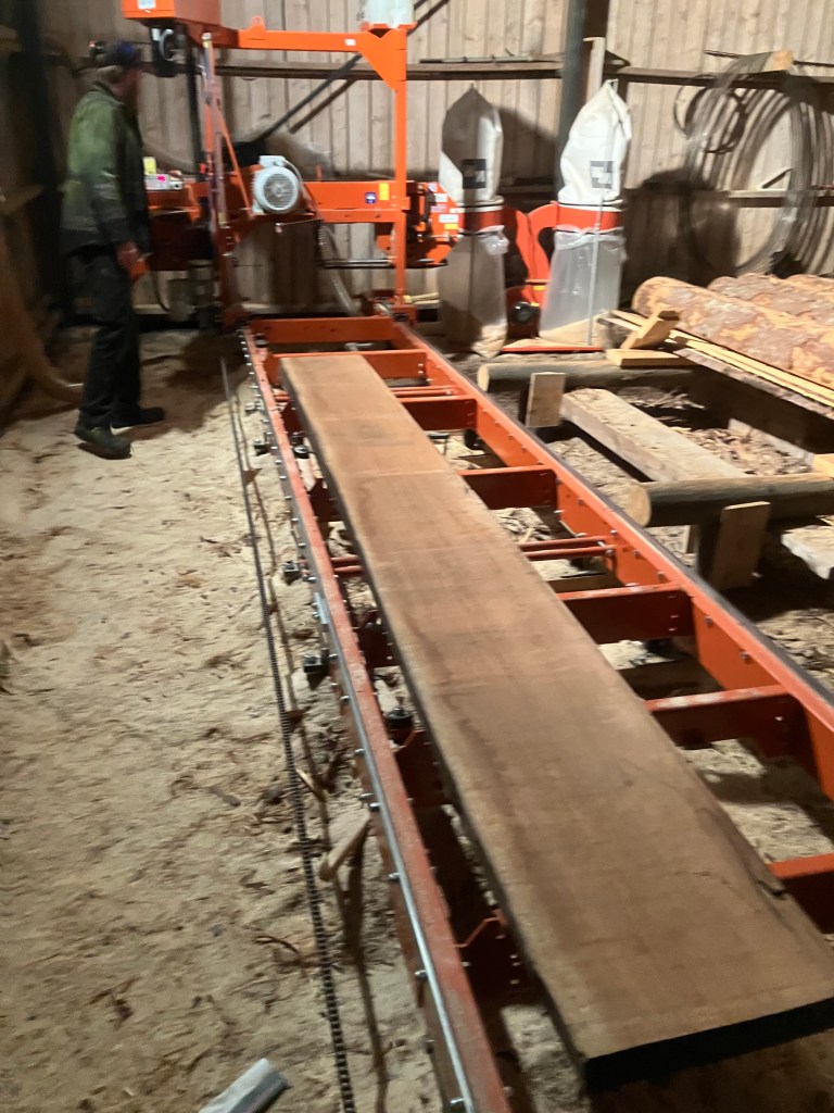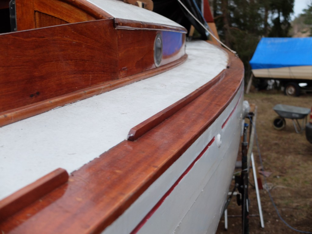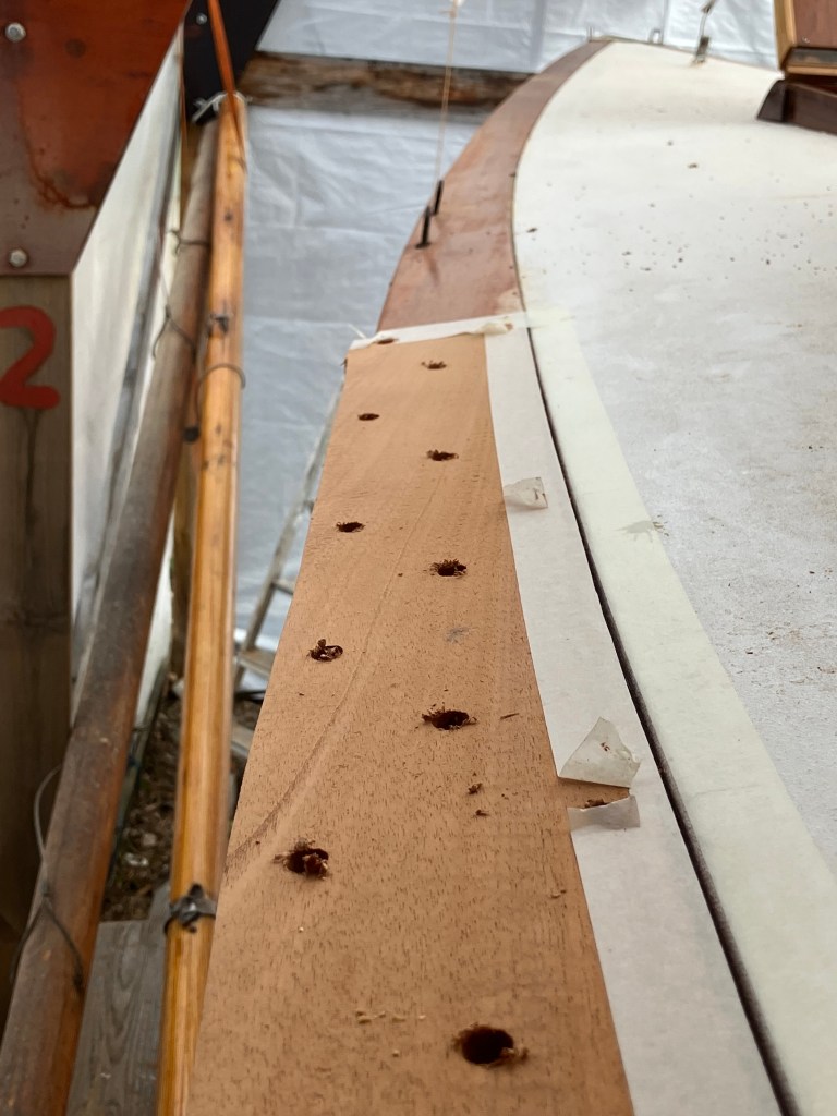 Nu var jag så långt kommen att jag var tvungen att få tag på mahogny till bl.a. skarndäcket. Hittade en planka i Oskarshamn som hade måtten 380 cm x 40cm x 8 cm. Mått som är helt ohanterbara för de flesta. Jag hittade en man som har en vertikalsåg, en bandsåg som sågar liggande ämnen. Jag beställde en uppsågning av plankan i dimensionen 17 mm. Det blev sådär, men jag fick ut 12 mm av alla brädor. Planhyveln fick jobba en del. Jag använder de gamla skarndäcken som mall. Delar upp längden i tre delar som ursprungligen var två delar. Sågar de mittersta enligt mallarna medan de främre och aktersta sågar jag så att jag spänner in de delarna, då de är avsmalnande och lättare att böja. Fräser det sista för att få en jämnare kurva. Monterar skarndäcken i förtjockad epoxi med rostfri skruv och med Boston Simson mot yttersta däcksribban. Träpropparna limmar jag med polyuretanlim.