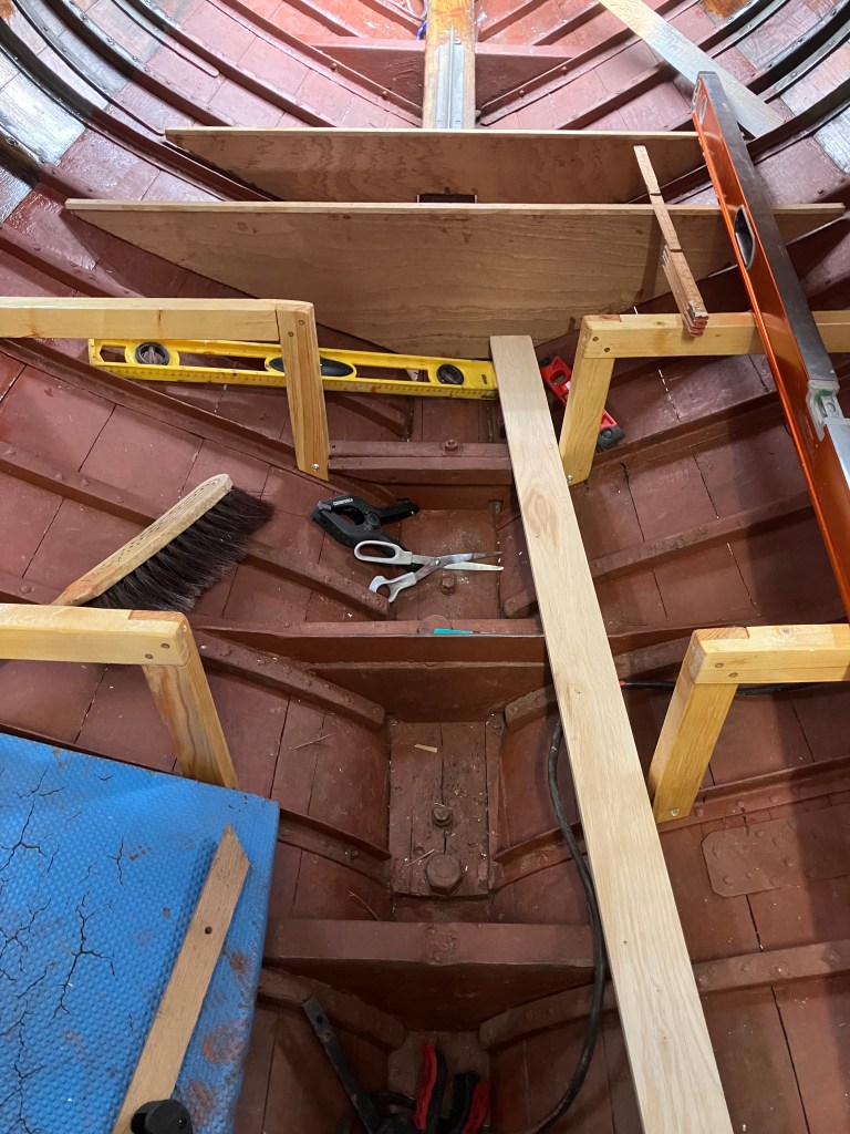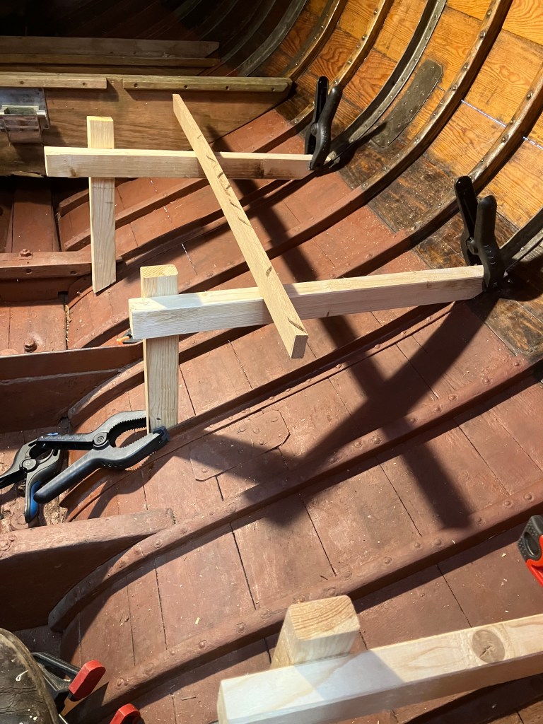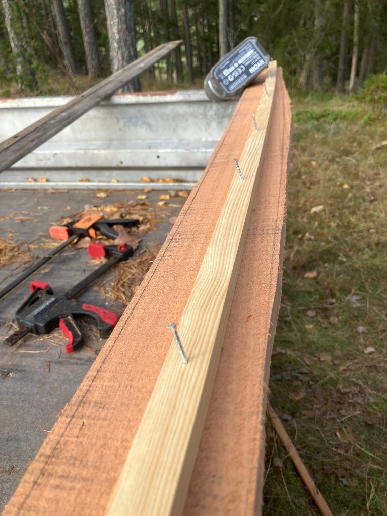 Döträet var i behov av utbyte. Sågade till två bitar av en drygt 100 år gammal furuplanka. Det blev furu men den ska nog vara av ek. Då visade sig också de i stort sett opåverkade kölbultarna. Limmade ihop de två delarna med förtjockad epoxi och drog ihop det med rostfria bultar av gängstång.